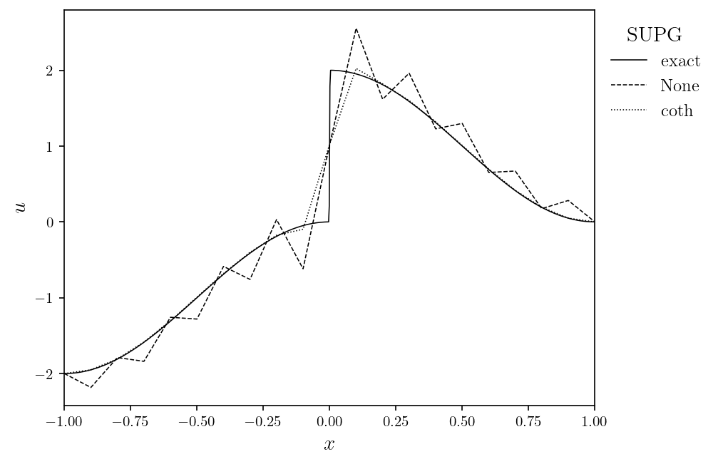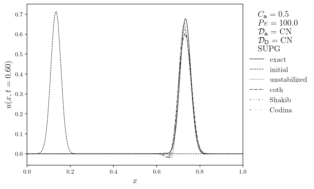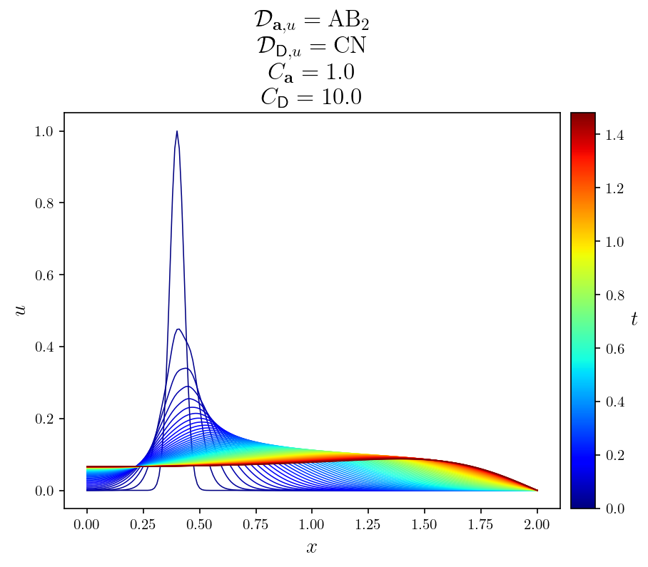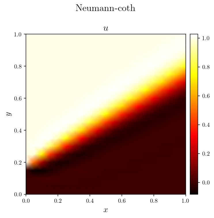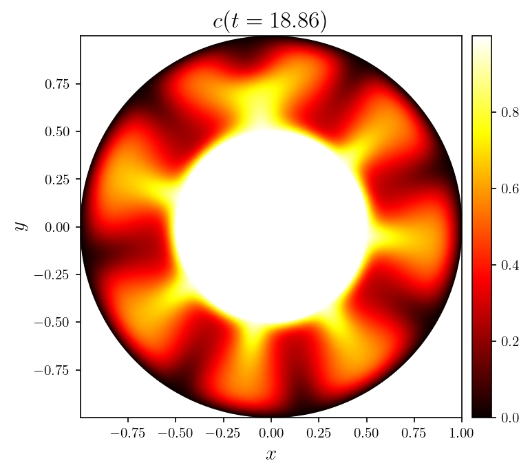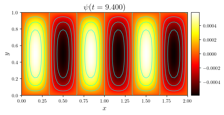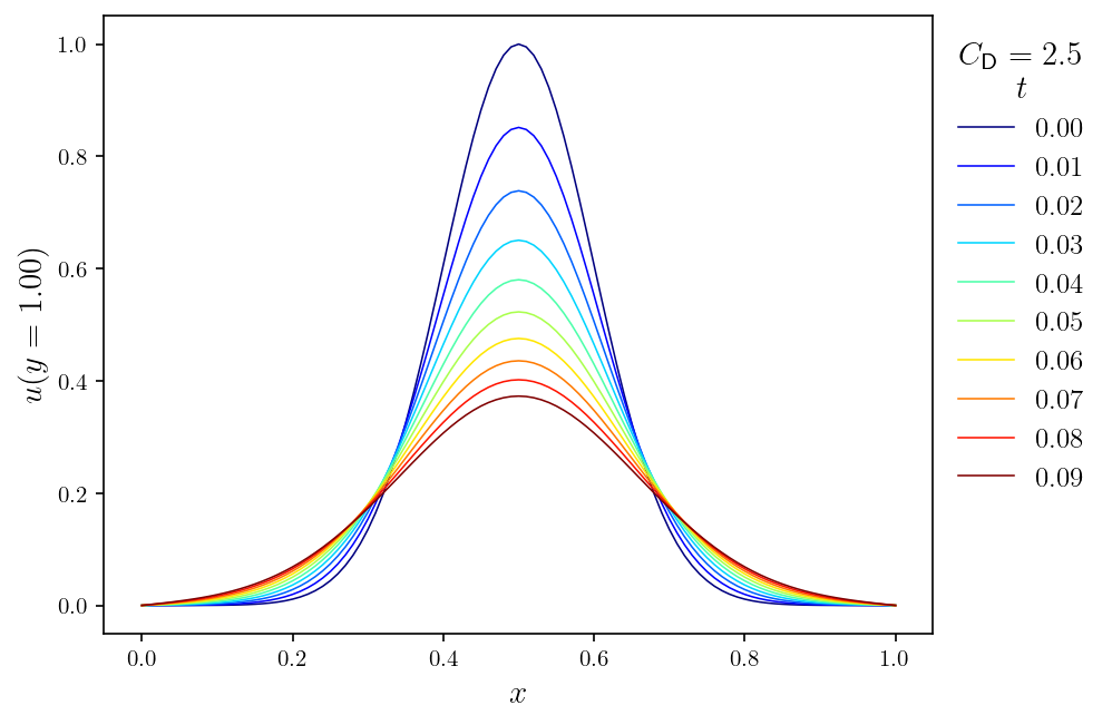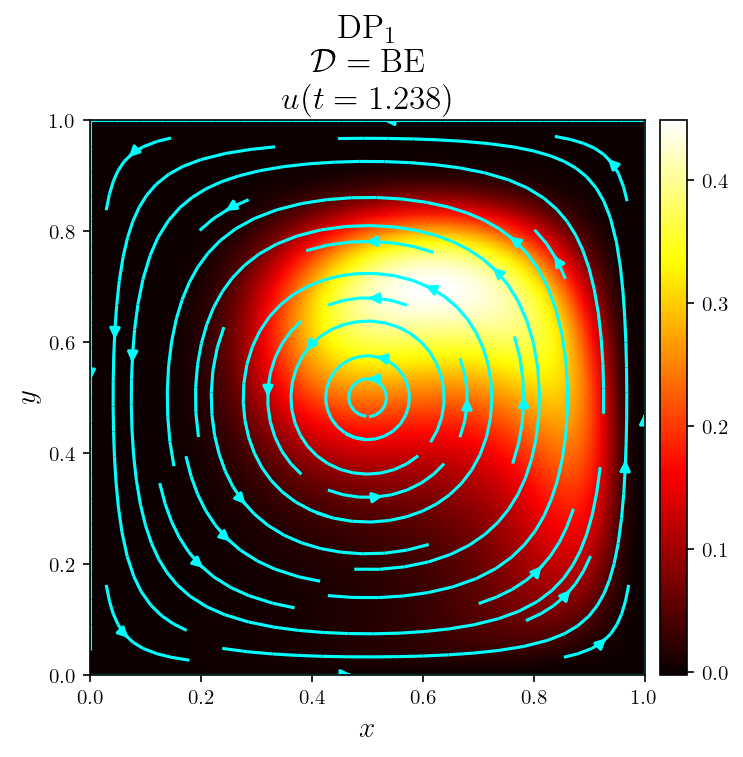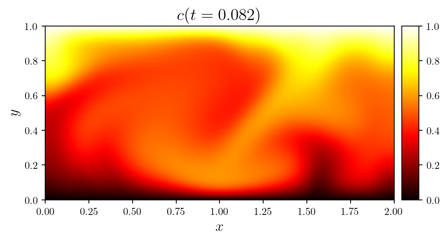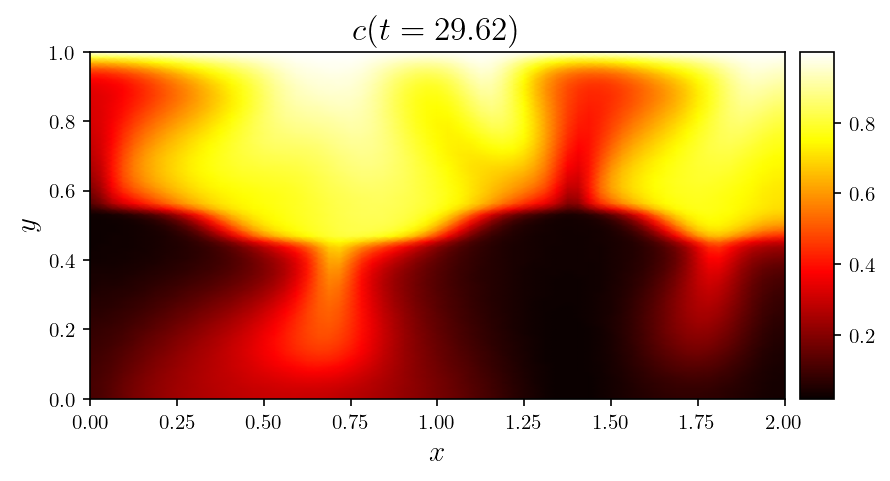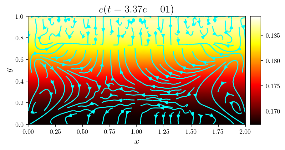 Gallery# Convection# Rayleigh-Bénard convection of a Darcy fluid in a porous rectangle Rayleigh-Bénard convection of a Darcy fluid in a porous annulus Rayleigh-Bénard convection in a porous semicircle Evolving convection of a Darcy fluid in an isotropic porous rectangle Evolving convection of a Darcy fluid in a cross-bedded porous rectangle Evolving convection of a Darcy fluid in a layered porous rectangle Evolving convection of a Darcy fluid in an inclined porous rectangle Elder convection of a Darcy fluid in a porous rectangle Rayleigh-Bénard convection of an isoviscous Stokes fluid Rayleigh-Bénard convection of a non-isoviscous Stokes fluid Thermosolutal convection of a Navier-Stokes fluid in a rectangle Rayleigh-Taylor instability of a Navier-Stokes fluid in a rectangle Marangoni convection of a Navier-Stokes fluid in a rectangle Rayleigh-Taylor instability of a Darcy-Brinkman fluid in a partially porous rectangle Rayleigh-Bénard convection of a Darcy-Brinkman fluid in a partially porous rectangle Fluids# Flow of a Darcy fluid through a lens of low permeability Flow of a Darcy fluid across an anticline of heterogeneous permeability Flow of a Darcy fluid in an annulus Flow of a Stokes fluid in a pressure-driven channel Flow of a Stokes fluid in a lid-driven cavity Flow of a Stokes fluid with vertical forcing Flow of a Stokes fluid in a corrugated channel Flow of Navier-Stokes fluid past a circular obstacle Flow of a Navier-Stokes fluid with vertical forcing Transport# DG advection of a step in an interval DG advection of a cosine in an interval DG advection of a rotating cone in a rectangle DG advection with a vortex in a rectangle DG steady advection-diffusion in an interval DG steady advection-diffusion in a rectangle DG advection-diffusion of a tophat on an interval DG advection-diffusion in a rectangle SUPG steady advection-diffusion in an interval SUPG steady advection-diffusion of the Hemker problem SUPG steady advection-diffusion with a skew velocity SUPG advection-diffusion of a Gaussian in an interval SUPG advection-diffusion of a rotating pulse in a rectangle Introductory# Poisson equation in a rectangle Poisson equation on an annulus Vector Poisson equation in a rectangle Diffusion of a Gaussian in an interval Diffusion of a Gaussian in a rectangle Advection of a Gaussian in an interval Advection-diffusion of a Gaussian in an interval Helmholtz eigenvalue problem in a rectangle Helmholtz boundary value problem in a rectangle Mathieu eigenvalue problem in an interval